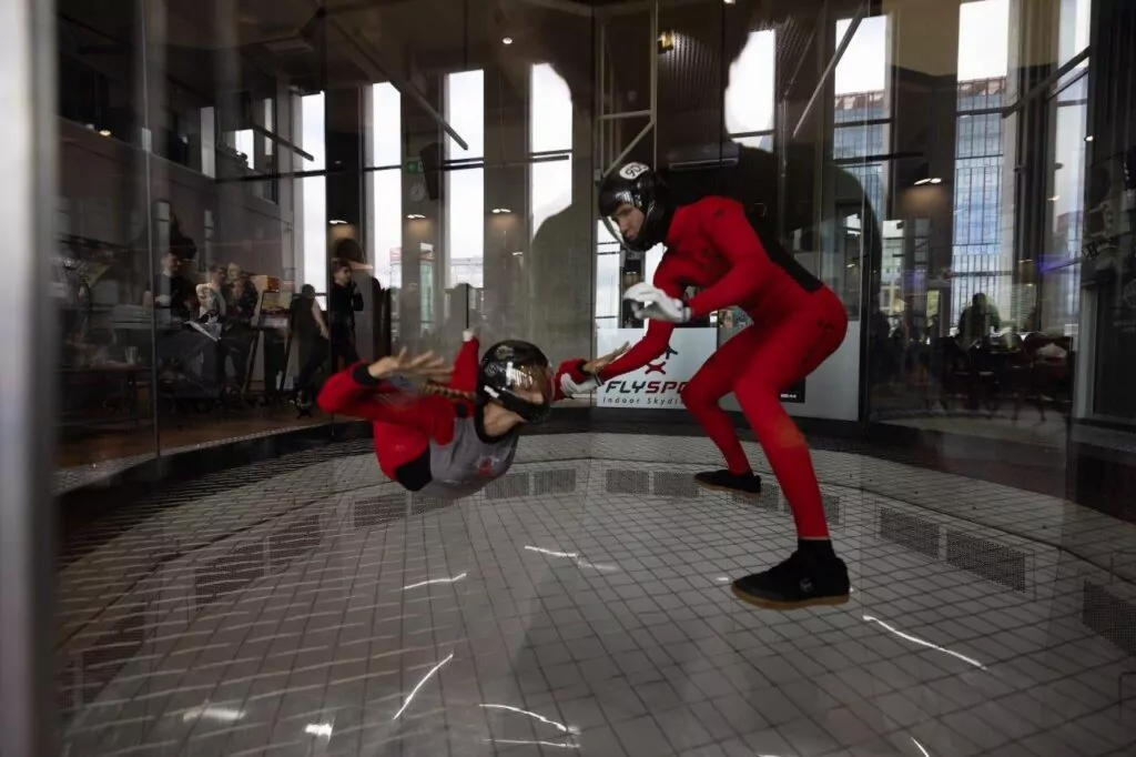 Na zakończenie wizyty we FLYSPOT jedna z uczestniczek warsztatów – Julia Kowalik – miała okazję latać w tunelu aerodynamicznym.
