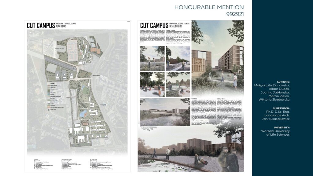 “CUT Campus – Innovation, Science, Climate”, autorzy: Małgorzata Danowska, Adam Dudek, Joanna Jabłońska, Marcin Pielak, Wiktoria Skrętowska, Szkoła Główna Gospodarstwa Wiejskiego w Warszawie. Opieka – dr inż. arch. kraj. Jan Łukaszkiewicz.