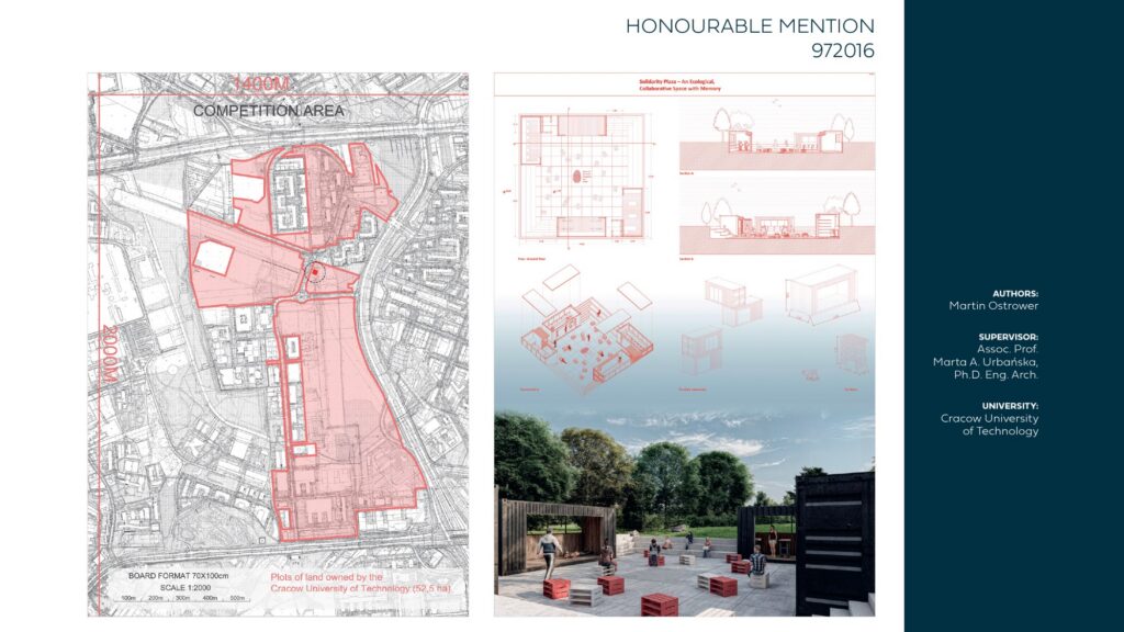 “Solidarity Plaza – An Ecological, Collaborative Space with Memory”, autor: Martin Ostrower, Politechnika Krakowska. Opieka – dr inż. arch. Marta A. Urbańska, prof. PK.