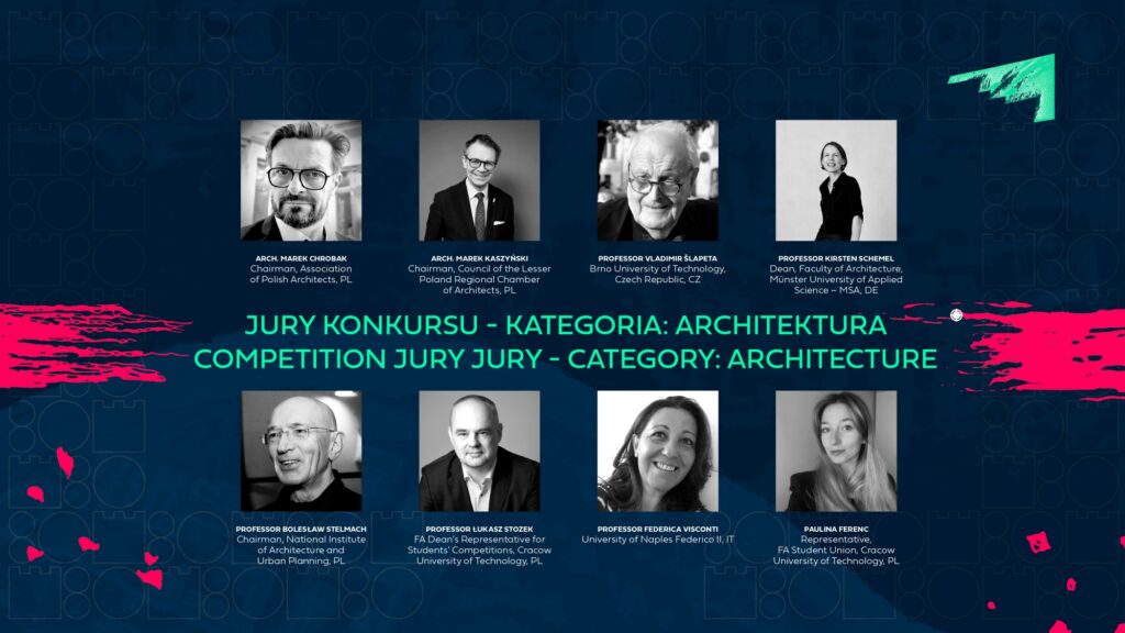 W kategorii “Architektura” jurorami byli: Arch. Marek Chrobak, prezes zarządu Stowarzyszenia Architektów Polskich (SARP); arch. Marek Kaszyński, przewodniczący Rady Małopolskiej Okręgowej Izby Architektów; prof. Dipl.-Ing. Kirsten Schemel, dziekan Architektury w Fachhochschule Münster; prof. ing. arch. Vladimír Šlapeta, DrSc., Brno University of Technology; prof. Bolesław Stelmach, dyrektor Narodowego Instytutu Architektury i Urbanistyki; dr inż. arch. Łukasz Stożek, prof. PK, pełnomocnik dziekan Wydziału Architektury PK ds. Konkursów Studenckich; prof. Frederica Visconti, Università degli Studi di Napoli „Federico II” i Paulina Ferenc, reprezentantka Samorządu Studentów Wydziału Architektury PK.