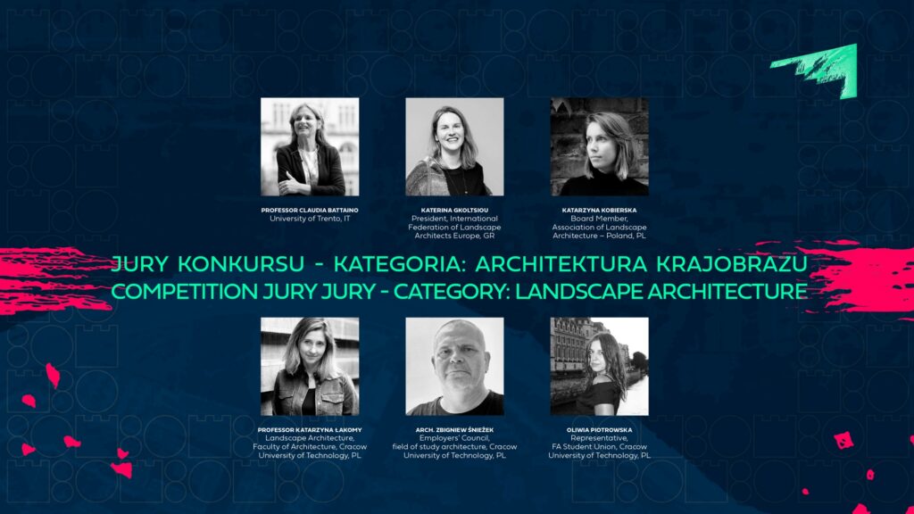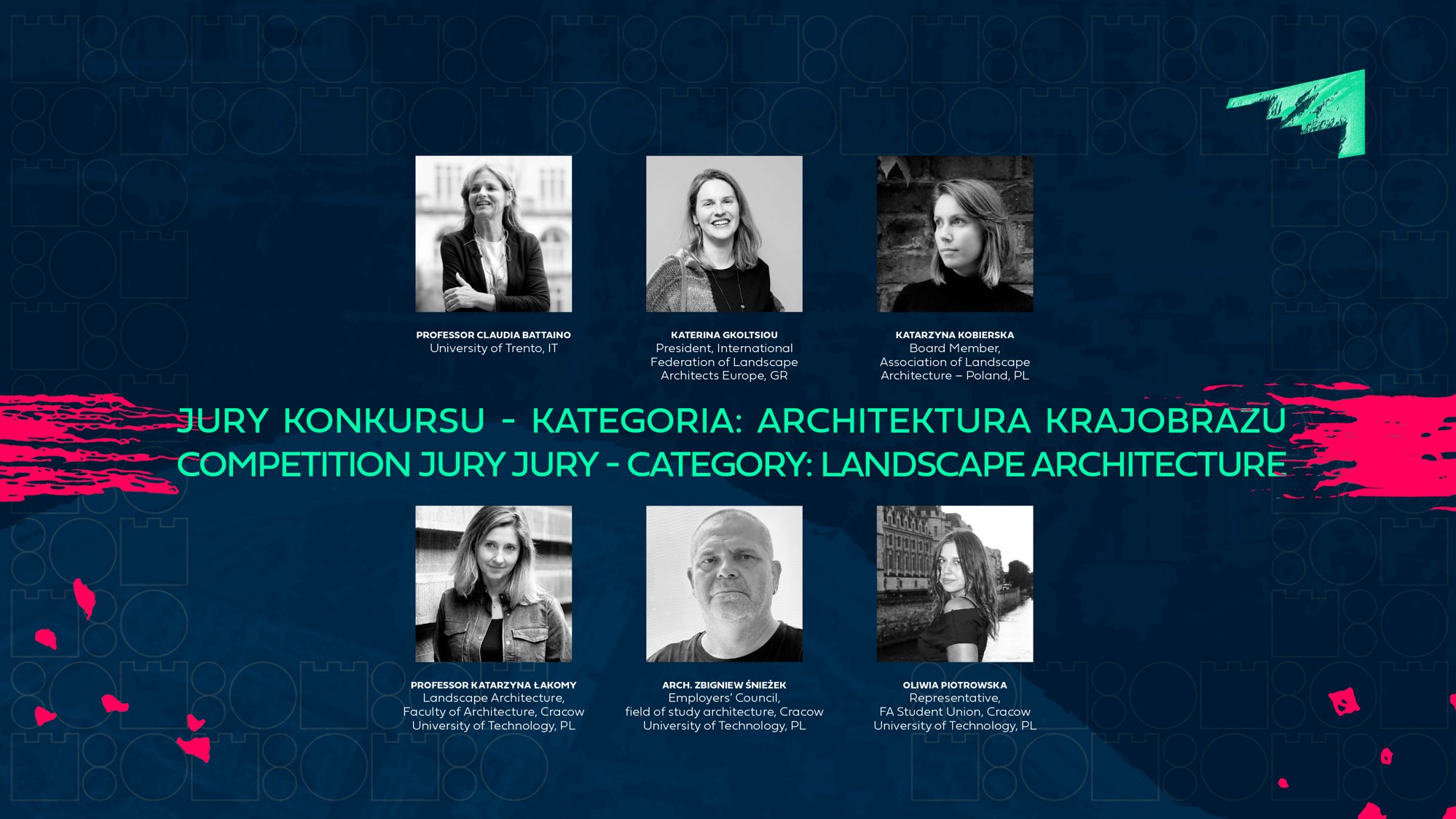 Projekty w kategorii “Architektura krajobrazu” były pod lupą następujących ekspertów: prof. Claudia Battaino, Università di Trento; Katerina Gkoltsiou, przewodnicząca Międzynarodowej Federacji Europejskich Architektów Krajobrazu; Katarzyna Kobierska, członkini Stowarzyszenia Architektury Krajobrazu; dr hab. inż. arch. Katarzyna Łakomy, prof. PK, Wydział Architektury PK; arch. Zbigniew Śnieżek, wiceprezes SARP ds. współpracy z partnerami – Oddział Kraków oraz Oliwia Piotrowska, reprezentantka Samorządu Studentów Wydziału Architektury PK.