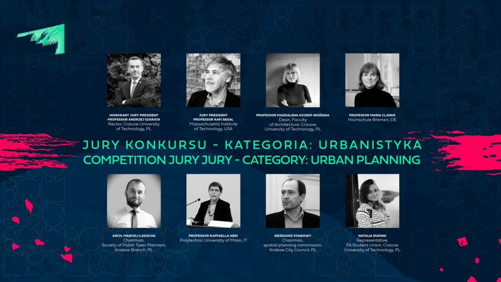 Kategorię “Urbanistyka” oceniali: przewodniczący jury prof. Rafi Segal; honorowy przewodniczący prof. dr hab. inż. Andrzej Szarata, rektor Politechniki Krakowskiej; prof. Maria Clarke z Hochschule Bremen; prof. dr hab. inż. arch. Magdalena Kozień-Woźniak, dziekan Wydziału Architektury Politechniki Krakowskiej; dr inż. arch. Marceli Łasocha, adiunkt na Wydziale Architektury PK; prof. Raffaella Neri z Politechniki Mediolańskiej; Grzegorz Stawowy, przewodniczący Komisji Planowania Przestrzennego w Radzie Miasta Krakowa oraz Natalia Rudnik, reprezentantka Samorządu Studentów Wydziału Architektury PK.
