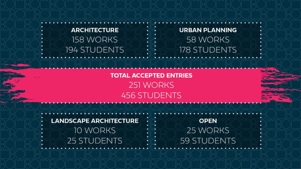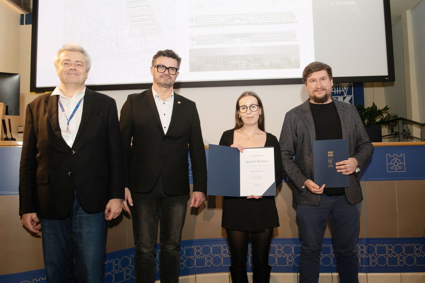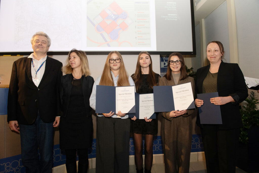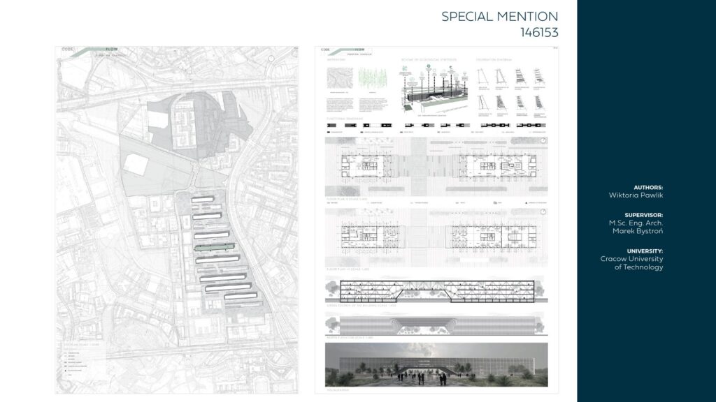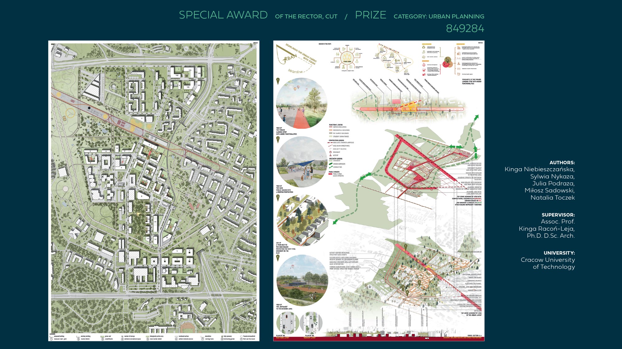 5. “Seamlining the Urban Fabric with Vision”, autorzy: Kinga Niebieszczańska, Sylwia Nykaza, Julia Podraza, Miłosz Sadowski i Natalia Toczek, Politechnika Krakowska. Opieka – dr hab. inż. arch. Kinga Racoń-Leja, prof. PK. Praca uhonorowana także Nagrodą Specjalną Rektora Politechniki Krakowskiej.