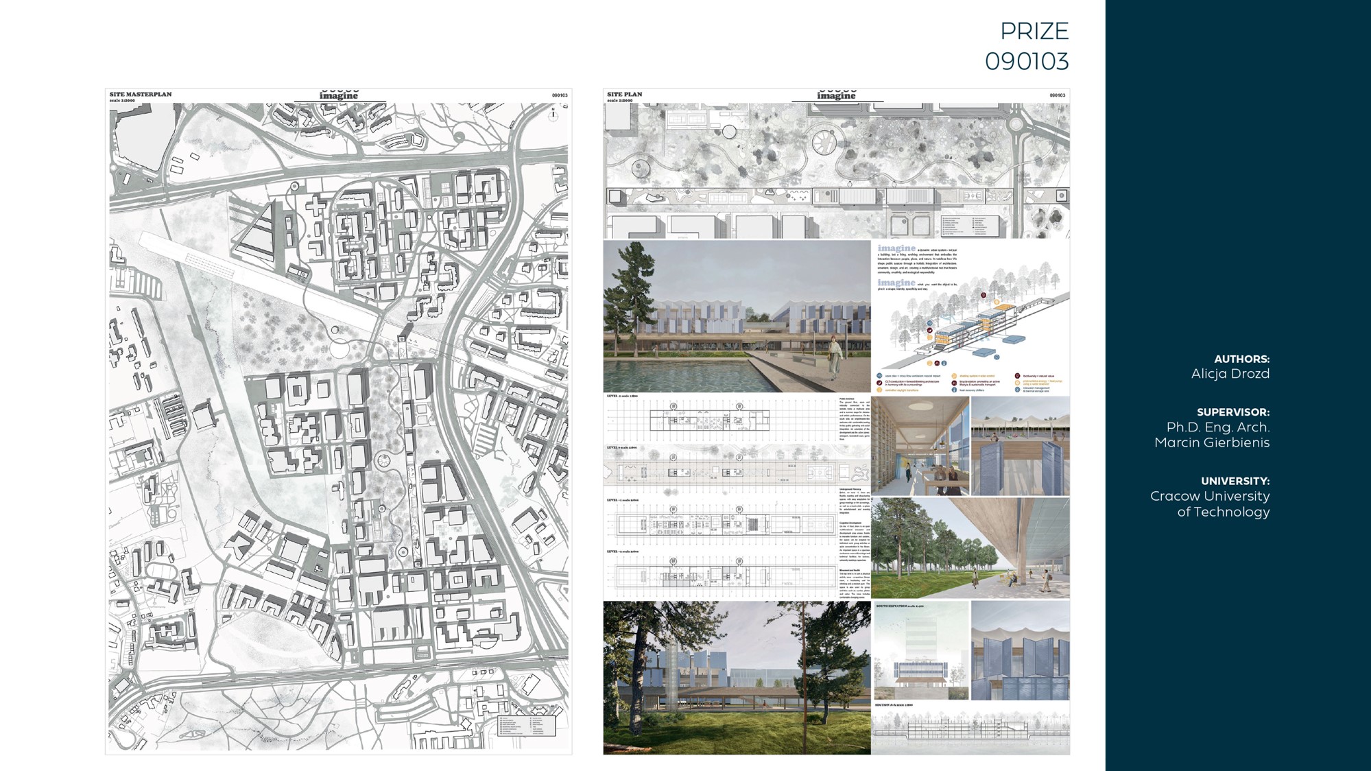 W kategorii “Architektura” nagrodę główną zdobyła koncepcja pn. “Imagine” autorstwa Alicji Drozd, studentki Politechniki Krakowskiej, stworzona pod kierownictwem dr inż. arch. Marcina Gierbienisa. W uzasadnieniu werdyktu jury czytamy: „Praca ta wzbudziła zainteresowanie jury od samego początku obrad. To najbardziej całościowe dzieło, jakie zostało zaprezentowane. Układ przestrzenny projektu urbanistycznego integruje obecny kampus z rejonem akademików. Minimalistyczna struktura przestrzenna łączy różne funkcje, ale co najważniejsze, umożliwia interakcję między różnymi grupami społecznymi. Nie tylko funkcje są elastyczne, ale także ruchome panele fasadowe budynków sprawiają, że ściany ożywają w miarę zmiany ich pozycji. (…) Przestrzeń w tej wizji podąża za globalnymi trendami rozwiązań architektonicznych, które wpisują się w koncepcję zrównoważonego rozwoju i mobilności. Zieleń składa się z różnych gatunków roślin i drzew realizując postulat bioróżnorodności. Budynki są wyposażone w systemy dynamicznej kontroli nad poziomem nasłonecznienia przy jednoczesnym wykorzystaniu paneli fotowoltaicznych, systemu odzysku wody opadowej oraz pomp ciepła do ogrzewania. Każdy budynek posiada dedykowaną stację rowerową. W strefie parkowej znalazła się też letnia scena koncertowa.