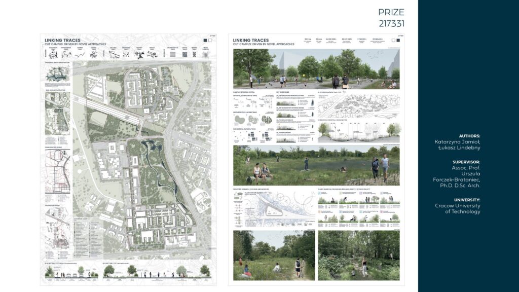 Nagrodę główną w kategorii “Architektura krajobrazu” odebrali Katarzyna Jamioł i Łukasz Lindebny z Politechniki Krakowskiej, podopieczni dr hab. inż. arch. Urszuli Forczek-Brataniec, prof. PK za projekt pn. nazwie “Linking Traces”, łączący naturalne i sztuczne elementy kampusowego krajobrazu. Projekt wprowadza kompleksowy system retencyjny oparty o zbieranie wód opadowych na dużym obszarze oraz strefę suchej rzeki – rozwiązanie polegające na uformowaniu koryta (niecki) i wypełnieniu go kamieniami, żwirem lub otoczakami, które ma imitować naturalny strumień wodny. Jak wskazało jury: „Ciekawym pomysłem jest identyfikowanie poszczególnych wydziałów uczelni poprzez dobór roślin i ich kolorów zgodnie z identyfikacją kolorystyczną danego wydziału. Szczególnie docenione zostały rozwiązania przestrzeni otwartych i pawilonów wydziałowych, które tworzą sieć sprzyjającą współpracy między mieszkańcami a społecznością akademicką w miejskim obszarze natury.”
