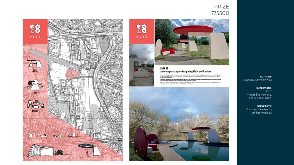 Nagroda główna trafiła tu do Szymona Zawadzińskiego z Politechniki Krakowskiej, który pod opieką naukową prof. dr hab. inż. arch. Marii Żychowskiej przygotował projekt o tytule “PARK 28”. Praca została doceniona przez jury za niekonwencjonalne podejście do tworzenia nowej przestrzeni. Opiera się na transformacji prostokątnego trapezu z kwadratowym otworem, który poprzez szereg modyfikacji przybiera formę różnych elementów architektonicznych. – W rezultacie – od wolnostojących lamp i basenu po systemy siedzeń – powstaje spójny krajobraz, zachęcający do różnych form aktywności. Przestrzeń parku nawiązuje do polskich parków rozrywki charakterystycznych dla lat 80. – czytamy w uzasadnienia wyboru jury.