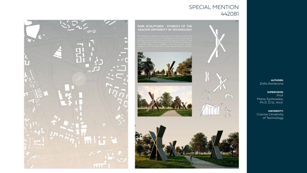 “Park Sculptures – Symbols of the Cracow University of Technology”, autorka Zofia Konieczna, Politechnika Krakowskiej. Opieka – prof. dr hab. inż. arch. Maria Żychowska.