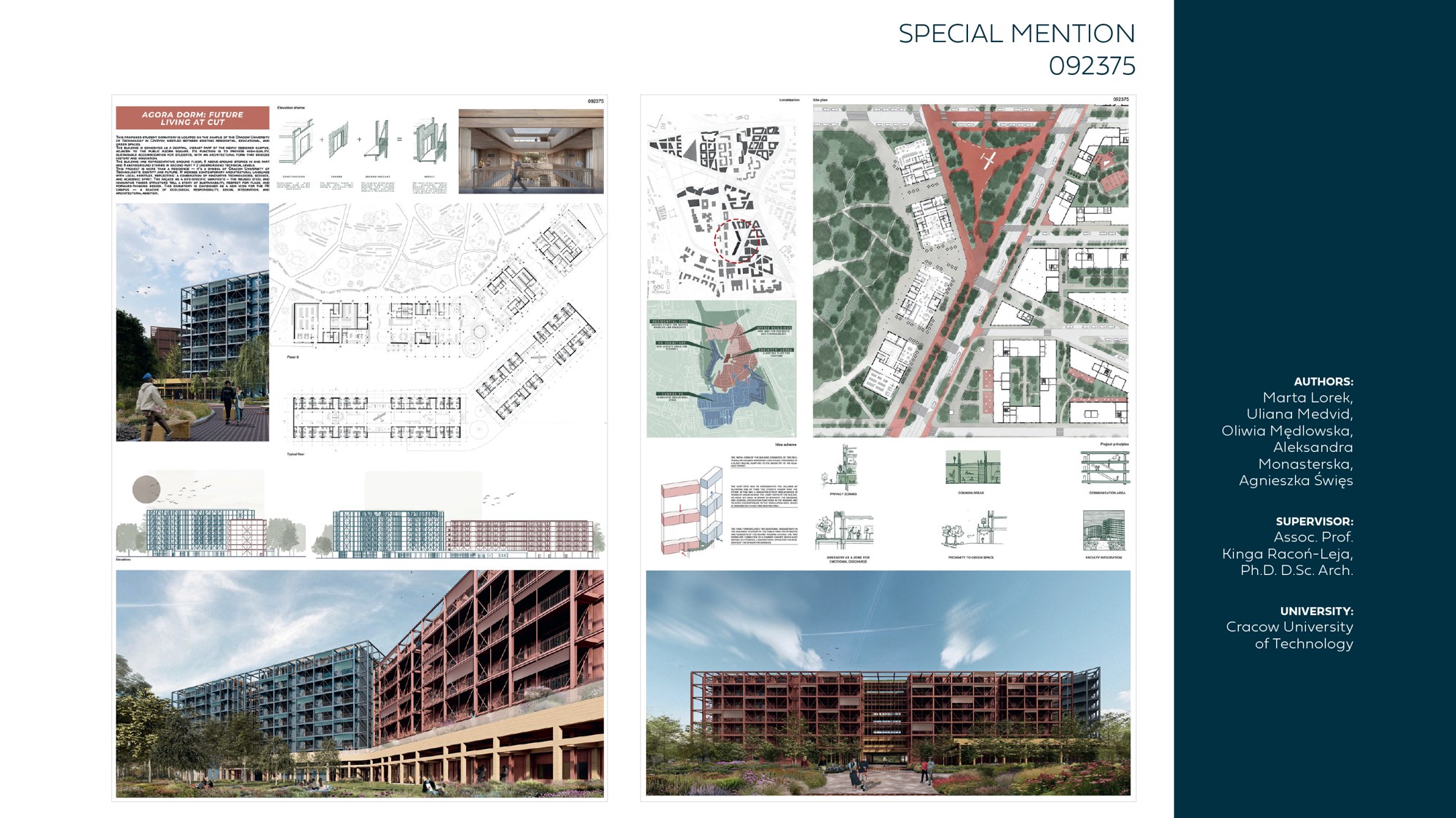 “Agora Dorm: Future Living at CUT”. Autorki: Marta Lorek, Uliana Medvid, Oliwia Mędlowska, Aleksandra Monasterska, Agnieszka Święs, Politechnika Krakowska. Opieka: dr hab. inż. arch. Kinga Racoń-Leja, prof. PK