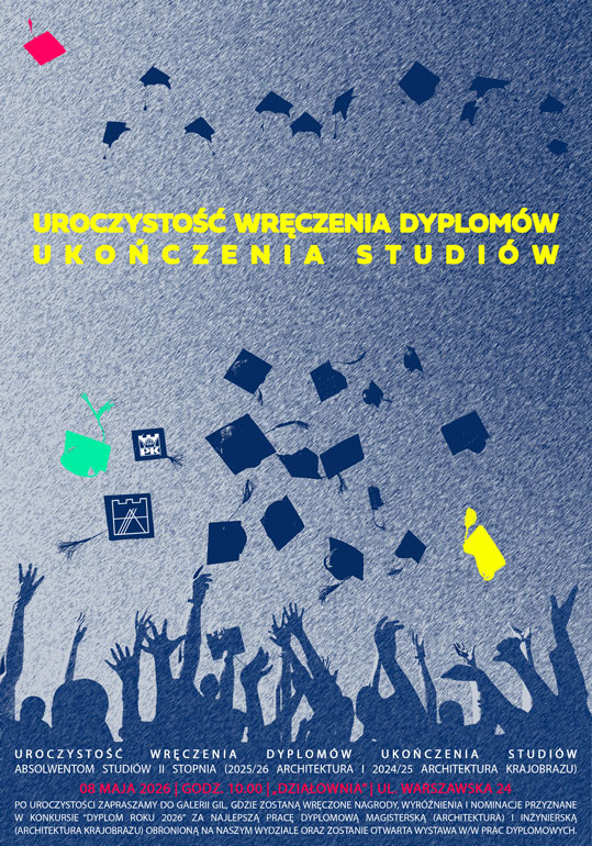 Dziekan Wydziału Architektury prof.dr hab. inż. arch. Magdalena Kozień-Woźniak serdecznie zaprasza na uroczyste wręczenie dyplomów ukończenia studiów absolwentom studiów II stopnia (2025/26 Architektura i 2024/25 Architektura Krajobrazu), które odbędzie się 8 maja 2026 roku o godzinie 10:00 w „Działowni”, ul. Warszawska 24.