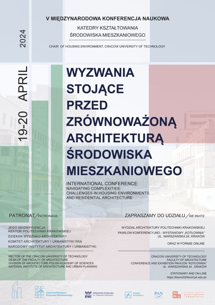 Katedra Kształtowania Środowiska Mieszkaniowego Politechniki Krakowskiej zaprasza do udziału w V Międzynarodowej Konferencji Naukowej, która odbędzie się w dniach 19-20 kwietnia 2024 roku w Pawilonie konferencyjno-wystawowym „Kotłownia” przy ul. Warszawskiej 24 w Krakowie oraz w formie online.