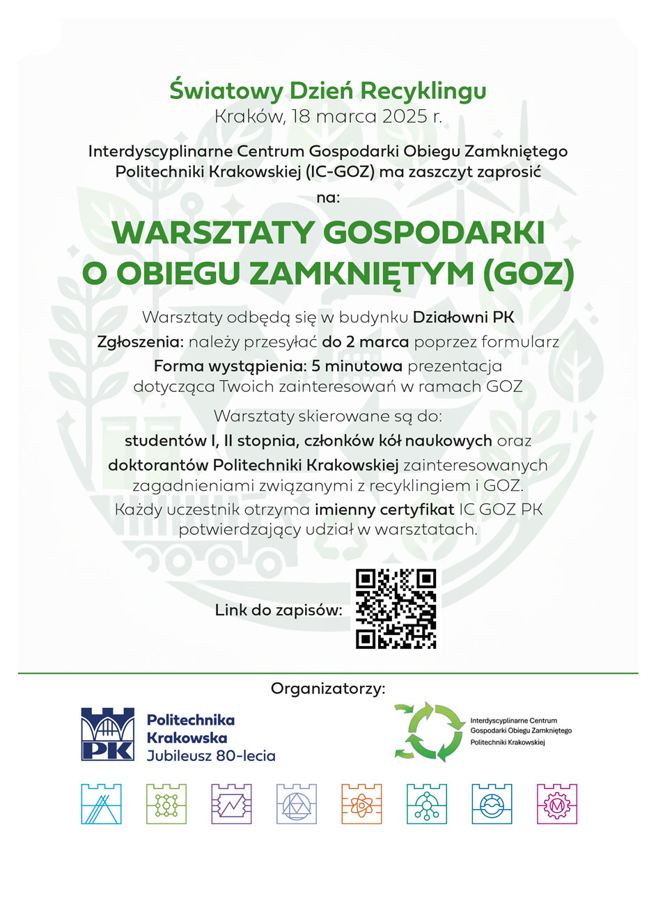 Interdyscyplinarne Centrum Gospodarki Obiegu Zamkniętego IC-GOZ Politechniki Krakowskiej z okazji ŚWIATOWYCH DNI RECYKLINGU ma zaszczyt zaprosić Państwa na: „WARSZTATY GOSPODARKI O OBIEGU ZAMKNIĘTYM (GOZ)”. Warsztaty skierowane są dla studentów I, II stopnia, członków kół naukowych oraz doktorantów wszystkich Wydziałów PK, których praca naukowa oraz zainteresowania związane są z recyklingiem oraz gospodarką o obiegu zamkniętym. W ramach Warsztatów planowany jest wykład wprowadzający, wystąpienia studentów i doktorantów w formie 5-minutowej prezentacji oraz tzw. networking.