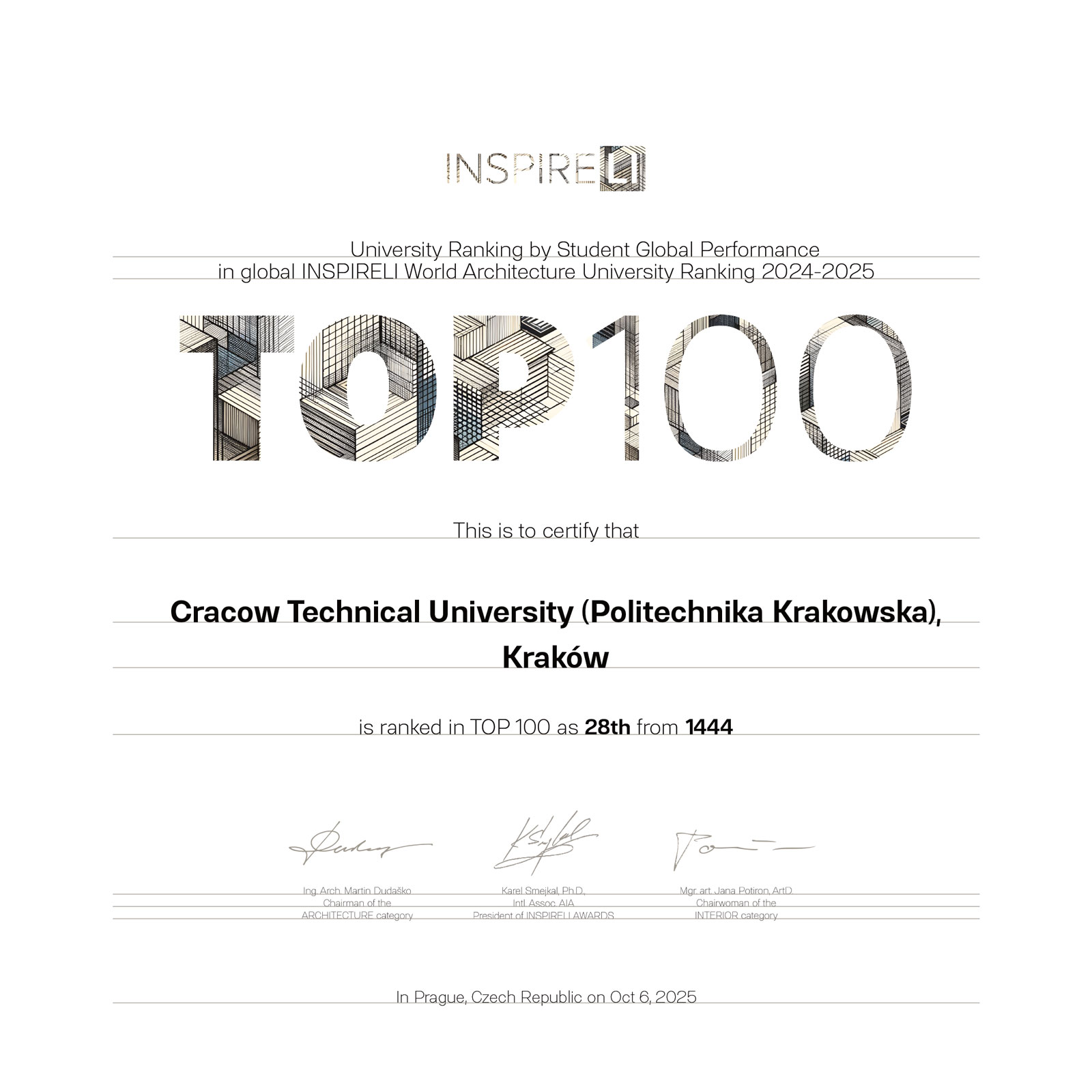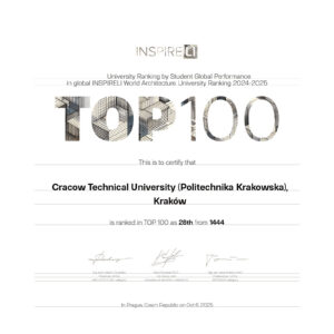 Wydział Architektury PK zdobył 28. miejsce spośród 1444 Uczelni na świecie w rankingu TOP 100 INSPIRELI AWARDS. Ranking INSPIRELI uwzględnia aktywność studentów i sukcesy międzynarodowe.
