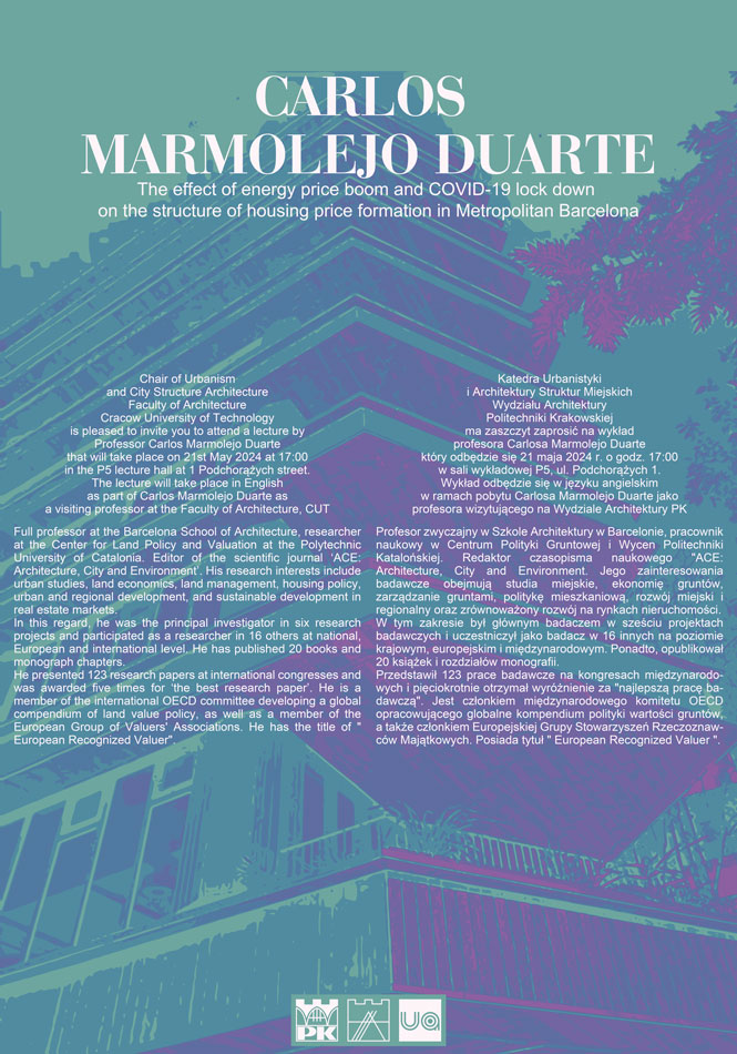 Katedra Urbanistyki i Architektury Struktur Miejskich Wydziału Architektury Politechniki Krakowskiej ma zaszczyt zaprosić na wykład profesora Carlosa Marmolejo Duarte, który odbędzie się 21 maja 2024 r. o godz. 17:00 w sali wykładowej P5, ul. Podchorążych 1.