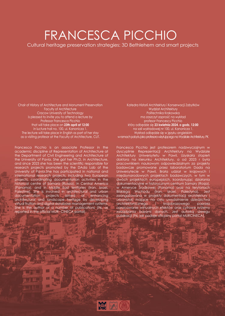 Katedra Historii Architektury i Konserwacji Zabytków Wydziału Architektury Politechniki Krakowskiej ma zaszczyt zaprosić na wykład profesor Francescy Picchio, który odbędzie się 23 kwietna 2024 r. o godz. 12:00 na sali wykładowej nr 100, ul. Kanonicza 1. Wykład odbędzie się w języku angielskim w ramach pobytu jako profesora wizytującego na Wydziale Architektury PK.