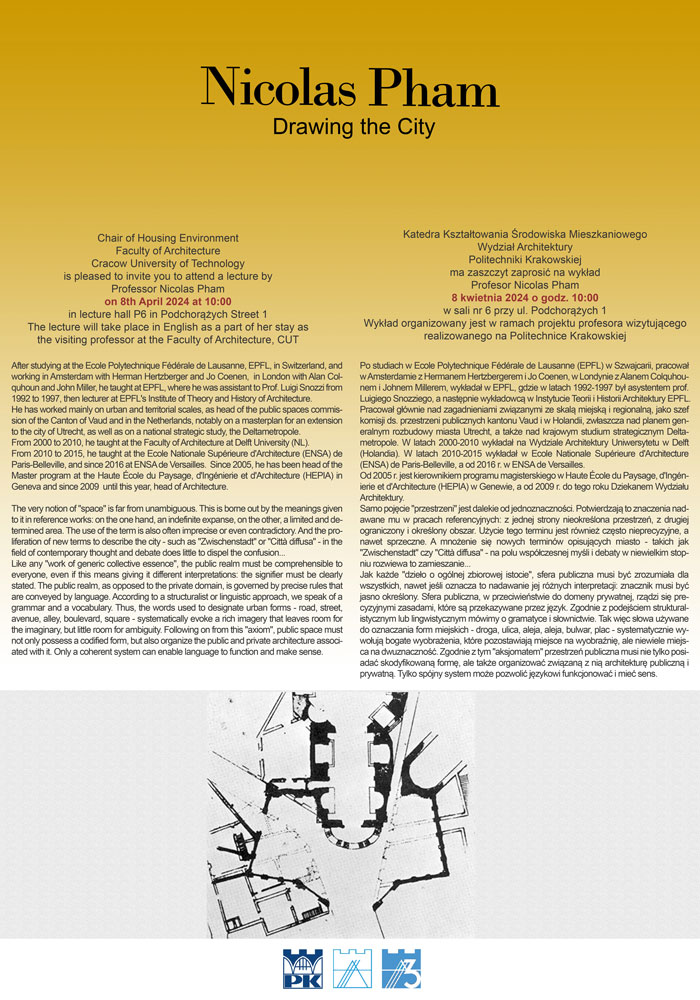 We are pleased to invite you to the lecture delivered by Professor Nicolas Pham, an academic at Ecole Nationale Supérieure d’Architecture de Versailles entitled Drawing the City, that will take place in Room P6 at ul. Podchorążych 1, 08.04.2024 at. 10.00.