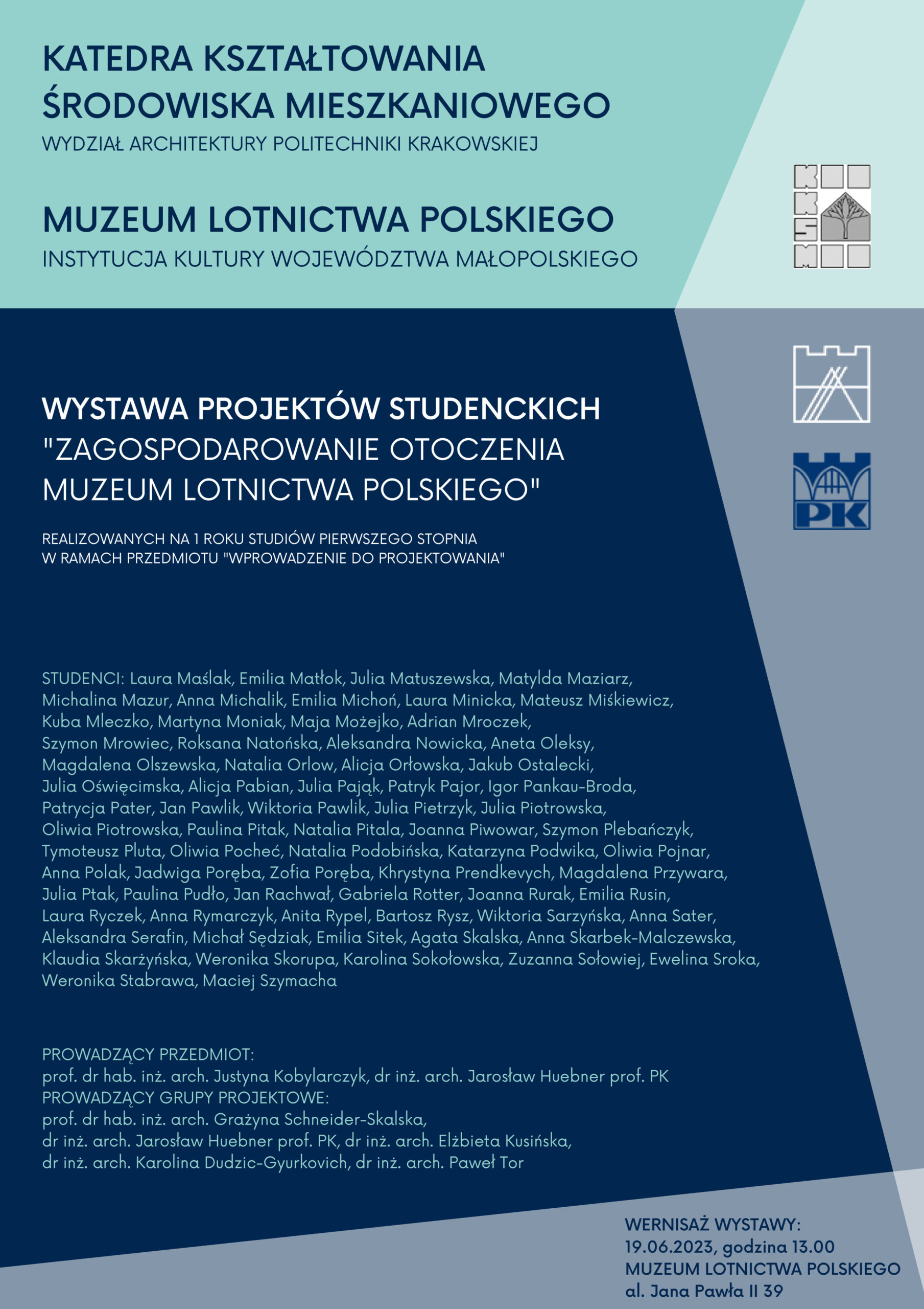 Na zakończenie drugiego semestru studiów w Katedrze Kształtowania Środowiska Mieszkaniowego studenci pierwszego roku mieli możliwość wzięcia udziału w wystawie projektów powstałych we współpracy z Muzeum Lotnictwa Polskiego. Wystawa odbywała się w Hangarze Głównym od 19 czerwca do końca lipca 2023 roku. W ramach tej wystawy prezentowane były koncepcje zagospodarowania przestrzeni publicznej przed Budynkiem Głównym Muzeum, będące efektem projektu kursowego prowadzonego przez prof. dr hab. inż. arch. Justynę Kobylarczyk wraz z zespołem prowadzących grupy ćwiczeniowe.