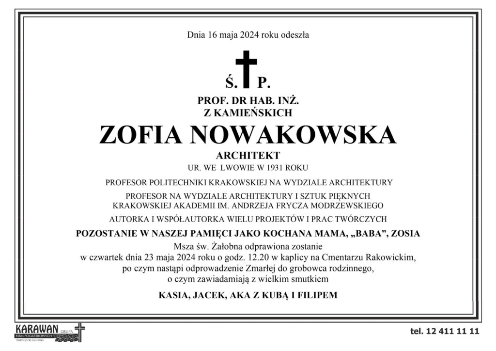 16 maja 2024 odeszła Ś.P. Prof. dr hab. inż. z Kamieńskich ZOFIA NOWAKOWSKA.