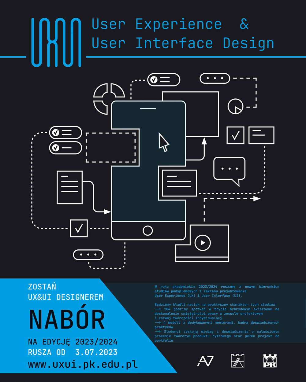 3 lipca 2023 roku rusza rekrutacja na nowe studia podyplomowe z zakresu projektowania User Experience (UX) i User Interface (UI). W czasie studiów realizowany jest całościowy proces twórczy produktu cyfrowego bazujący na realnych problemach projektowych. Od badań potrzeb użytkowników i analiz biznesowych po opracowanie koncepcji produktu, prototypowanie i weryfikacje z użytkownikami. Ostatni etap to opracowywanie spójnej graficznie wizji produktu cyfrowego (aplikacji, strony internetowej, interfejsu, architektury) animacji i jego prezentacji.